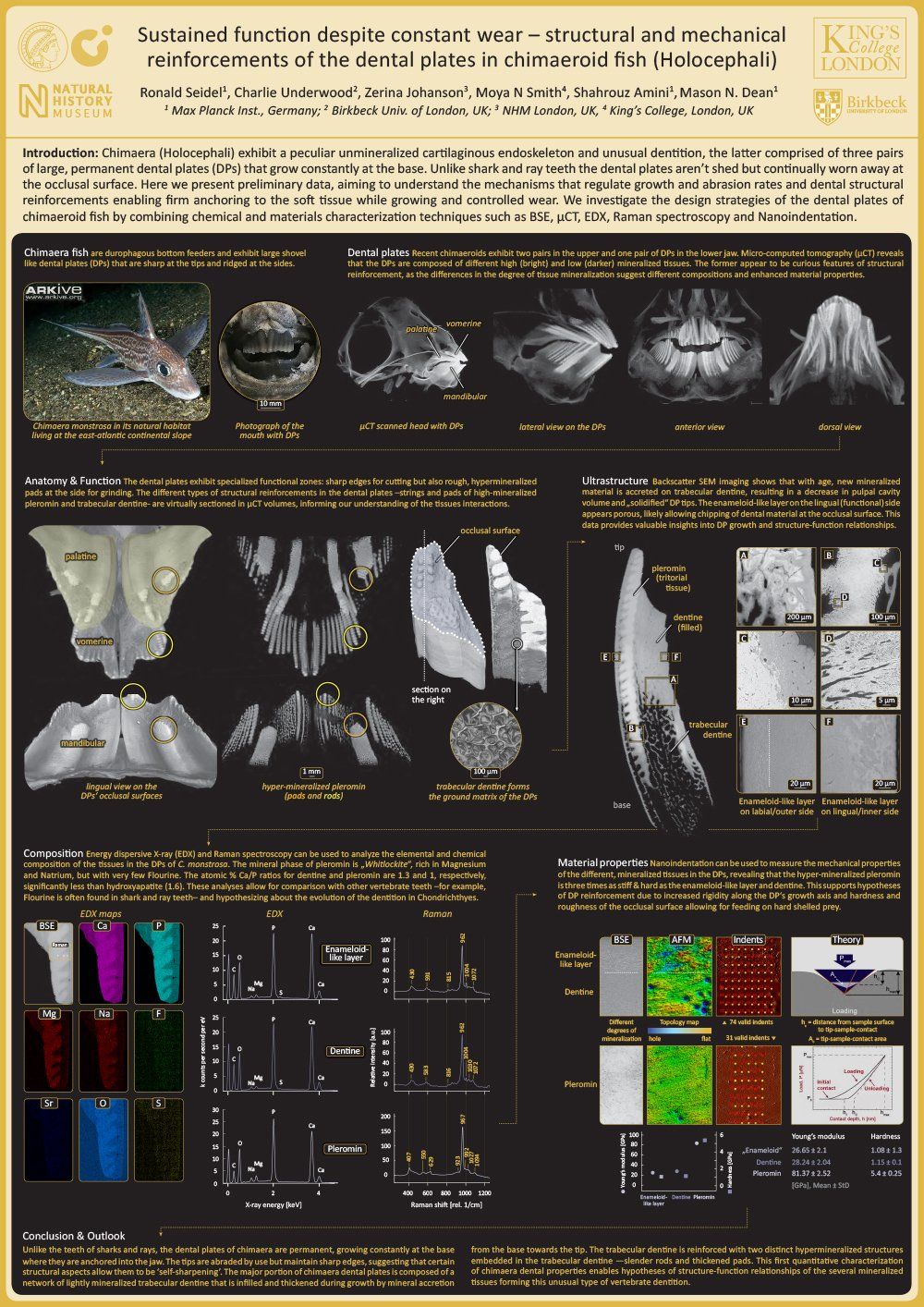 In contrast to sharks and rays (Elasmobranchii), chimaera fish (Holocephali) exhibit large pairs of permanent, constantly growing tooth plates (Elasmobranchii + Holocephali = Chondrichthyes). We study the structural reinforcements that maintain chimaera fish tooth plates' functionality despite constant wear. We presented our work at IAFSB (Integrative Approaches in Fish Skeletal Biology, 2018) and at the annual DZG meeting (Deutsche Zoologische Gesellschaft, 2018), and the article will be coming soon..