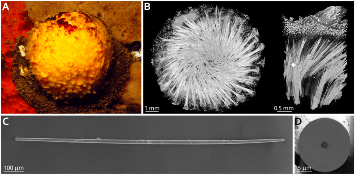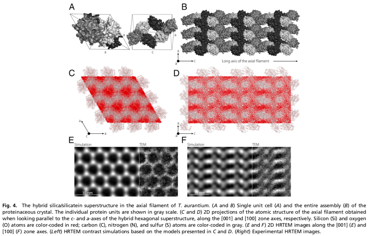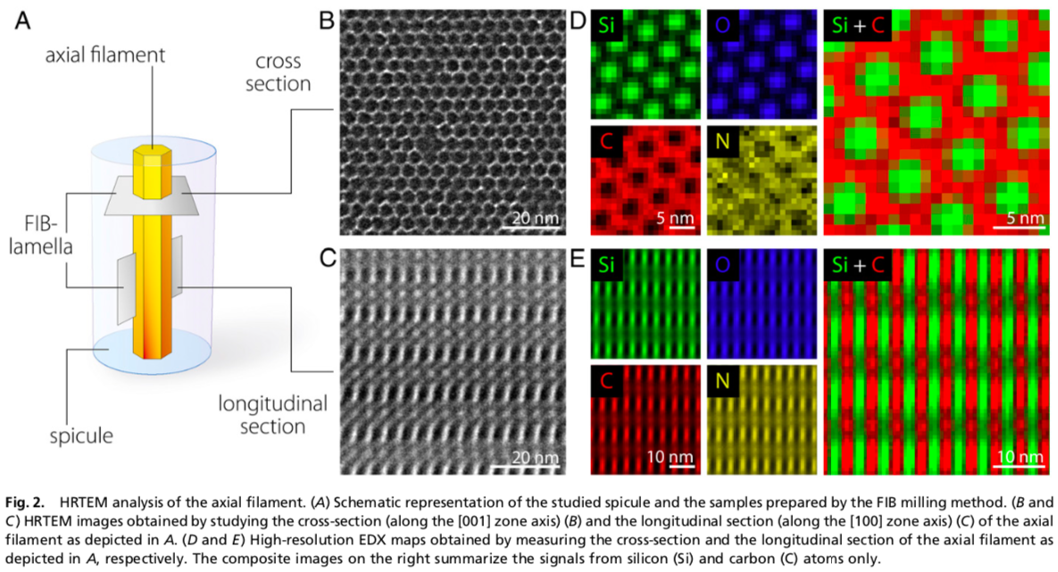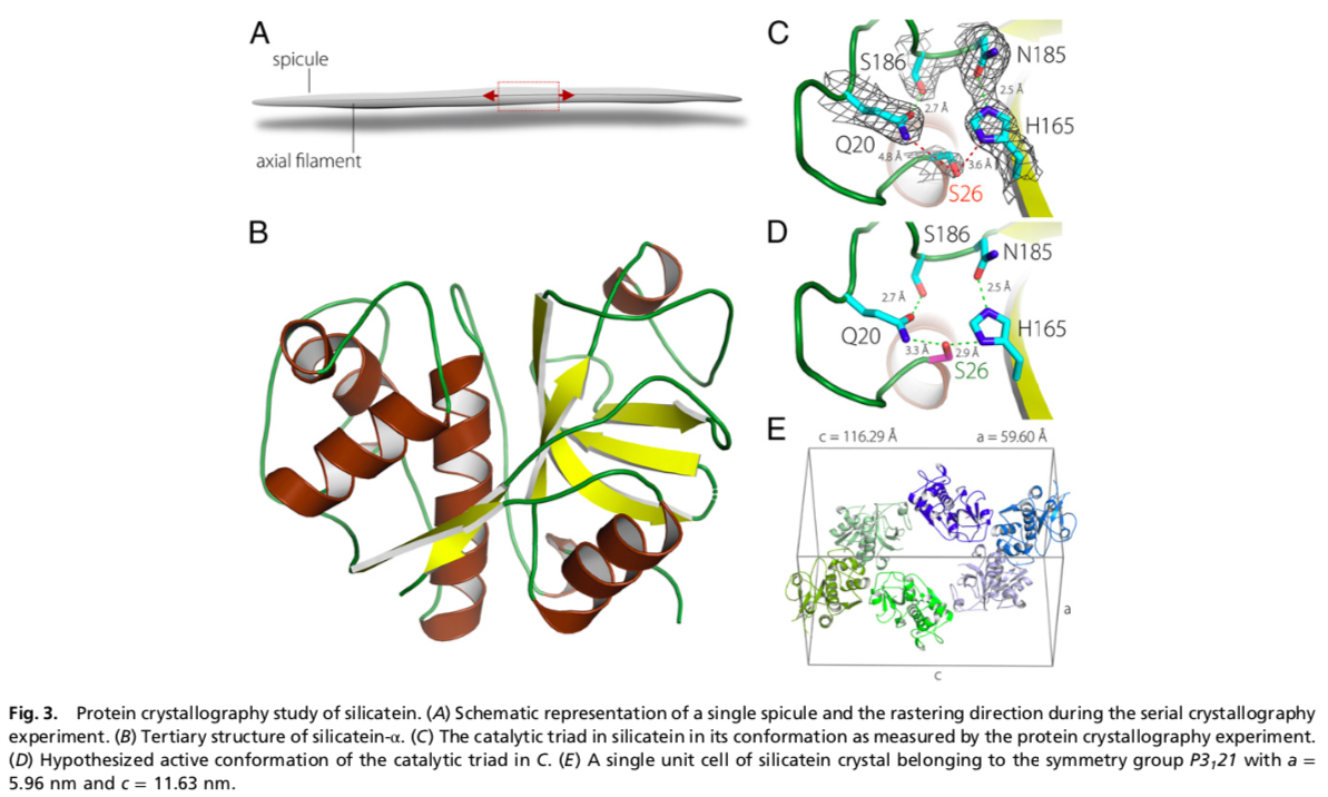 Formation of highly symmetric skeletal elements in demosponges, called spicules, follows a unique biomineralization mechanism in which polycondensation of amorphous silica is guided by a proteinaceous scaffold, the axial filament. The enzymatically active proteins, silicateins, are assembled into a slender hybrid silica/protein crystalline super- structure that directs the morphogenesis of the spicules. Despite the biological and biotechnological importance of silicatein, its tertiary structure was never determined. In our article published in PNAS, we report the atomic structure of silicatein and the entire mineral/organic hybrid assembly with a resolution of 2.4 Å. In this work, the serial X-ray crystallography method was successfully adopted to probe the 2-μm-thick filaments in situ, being embedded inside the skeletal elements. In combination with imaging and chemical analysis using high-resolution transmission electron microscopy, we provide detailed information on the enzymatic activity of silicatein, its crystallization, and the emergence of a functional three-dimensional silica/protein superstructure in vivo. Ultimately, we describe a naturally occurring mineral/protein crystalline assembly at atomic resolution. (Görlich et al. 2020. Natural hybrid silica/protein superstructure at atomic resolution. PNAS Nov 2020, 202019140; DOI: 10.1073/pnas.2019140117).
