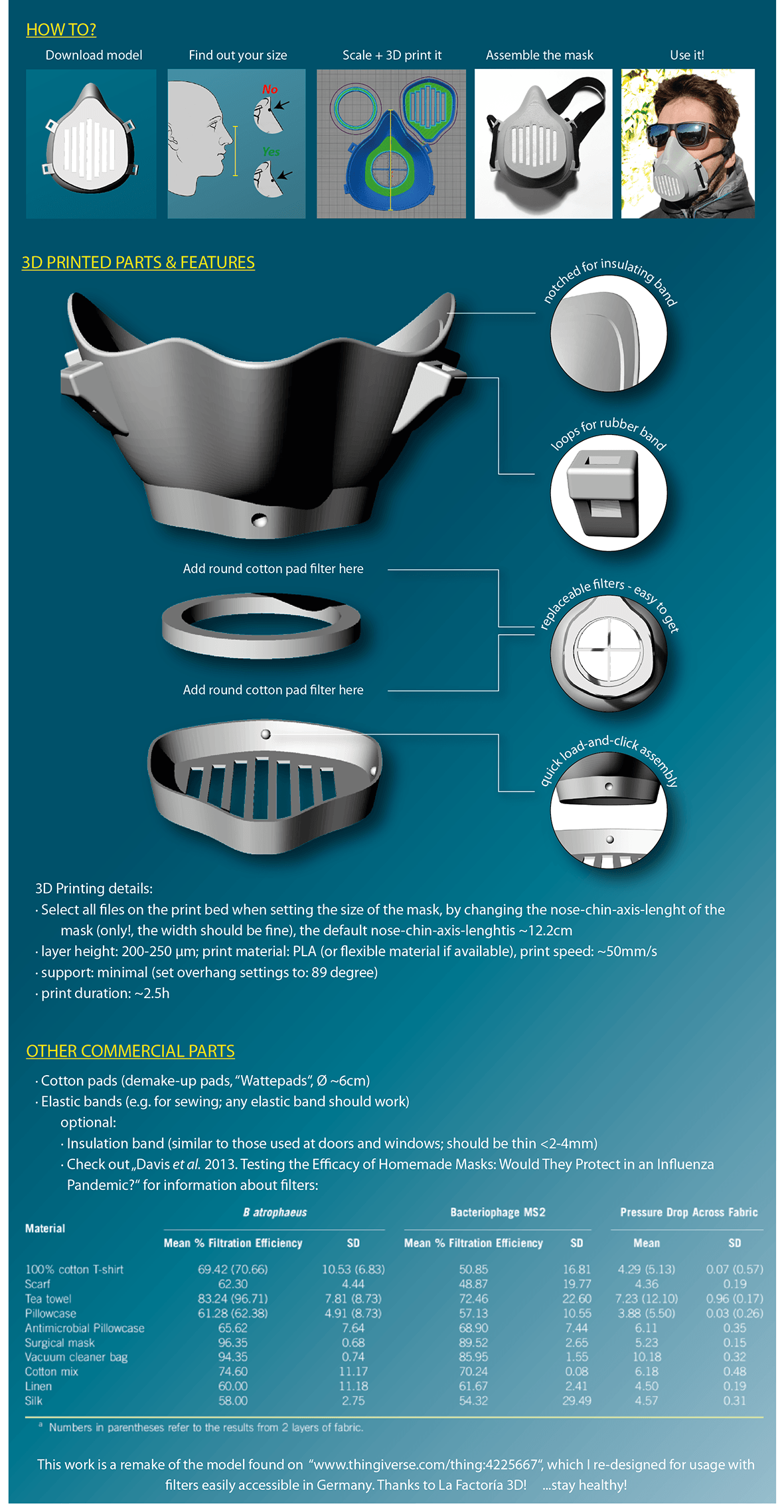 Dieses Modell beinhaltet die Maske, aber nicht den erforderlichen Filter, um die Ausbreitung von Krankheitserregern effektiv zu blockieren. Außerdem könnten zusätzliche Isolierungsmaßnahmen erforderlich sein, um das Gesicht ohne Luftspalte richtig anzupassen. Ich habe nicht die notwendigen Analysemittel, um die Wirksamkeit mit Garantien zu bestätigen. Ich erinnere Sie nochmals daran, dass die Anwendung dieses Modells auf eigenes Risiko erfolgt.