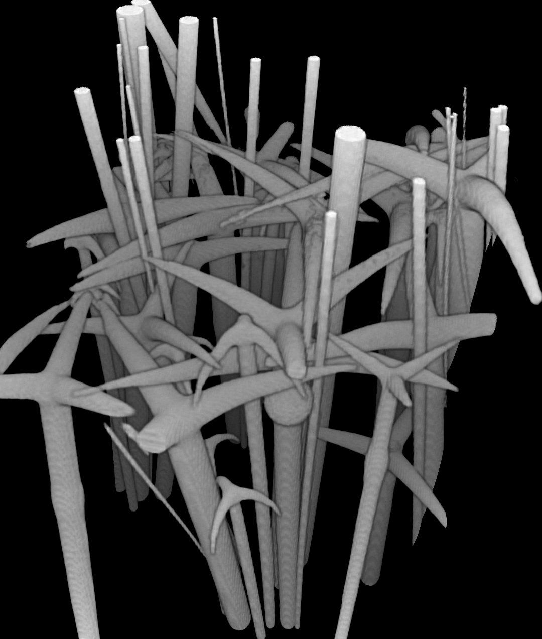 species and subsequent segmentation for quantifying spicules' number, distribution and characterizing their organisation is very labor intensive. We explore machine learning approaches to gain fast segmentations of the many thousands of individual glas spicules embedded in the in the sponge tissue. In addition to Python, we also use ImageJ and Amira for data preparation and analysis.